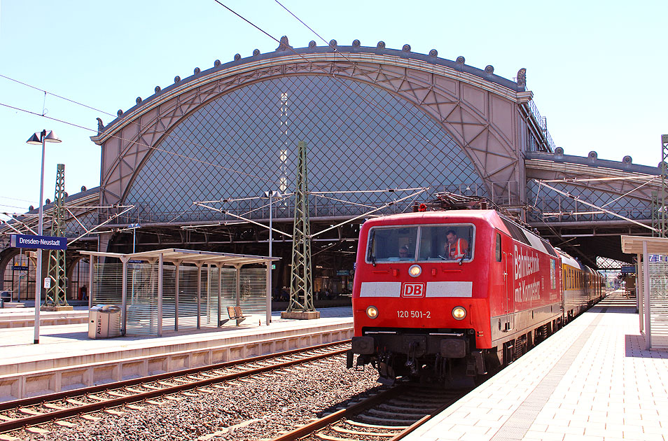 Im Bahnhof Dresden-Neustadt steht hier die 120 501-2 mit einem Messzug auf Gleis 7. Oberhalb von der Lok die historische Bahnhofshalle vom Bahnhof Dresden-Neustadt. Digi Foto: IMG_5004.JPG Digi Fotos: 0273, FP5 (D23/D6/dobryiden16) Foto: Lars Brüggemann |
