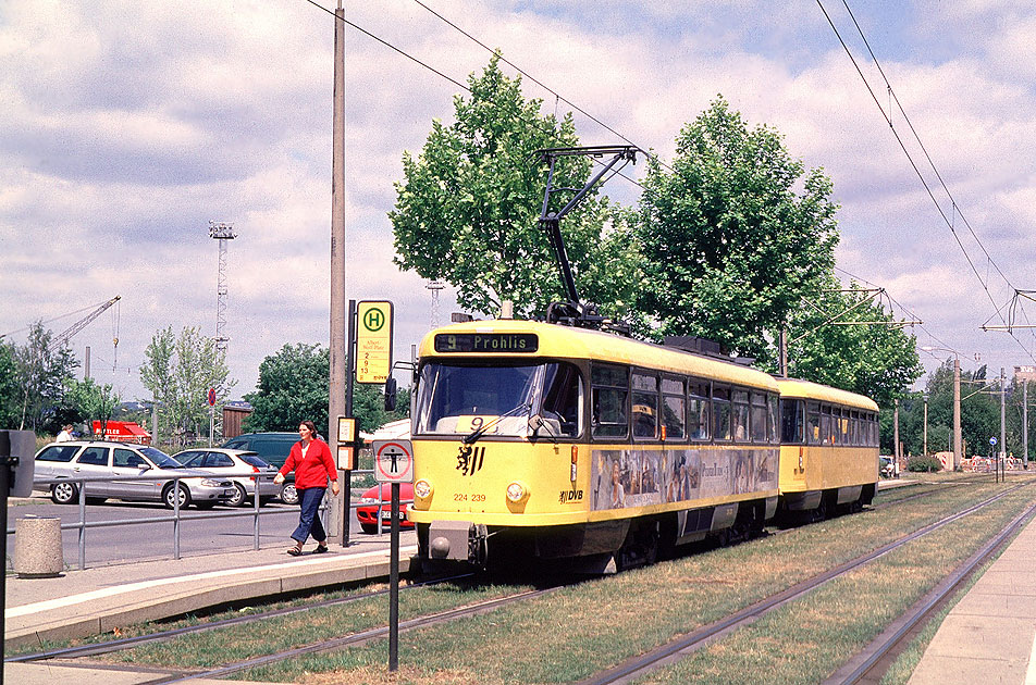 Bahnen in Dresden: Als Linie 9 nach Prohlis halten die DVB-Tatra-Wagen 224 239 und 274 007 an der Haltestelle Albert-Wolf-Platz am 25. Juni 2003. Tatra-Wagen im Planeinsatz sind in Dresden nun Geschichte, sie prägten Jahrzehnte das Bild der Dresdner Straßenbahn. Die Haltestelle Albert-Wolf-Platz liegt an der Straßenbahnstrecke nach Prohlis und wurde zusammen mit dieser 1981 eröffnet und diente der Erschließung der Plattenbausiedlung in Prohlis. Dia 8806-1 Foto CD Zusammenfassung Foto: Lars Brüggemann |