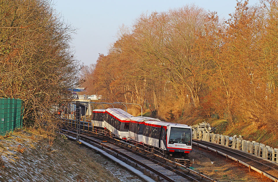 Drei Hochbahn DT5 (links) kommt am 6. Februar 2013 in Hamburg-Billstedt eingefahren. Digi Foto: IMGP6078.JPG Digi Fotos: 0233 Foto: Lars Brüggemann |