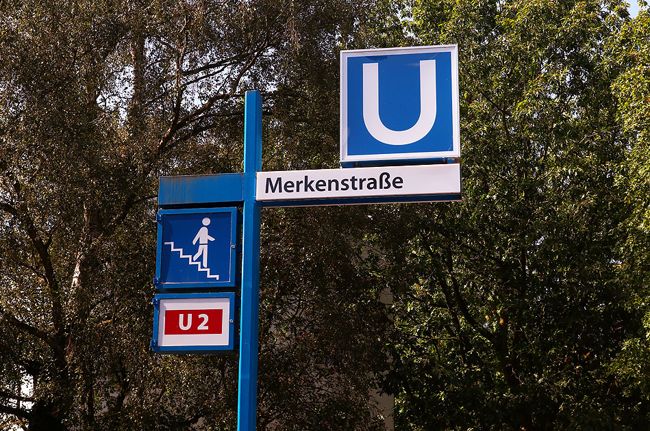 Ein Schild vom Bahnhof Merkenstraße in Hamburg-Billstedt. Die U-Bahn-Haltestelle Merkenstraße wurde am 31. Mai 1970 in Betrieb genommen. 1990 wurde die Strekenverlängerung von hier nach Mümmelmannsberg in Betrieb genommen. Digi Foto: IMG_5871.JPG Digi Fotos: 0371, FP10 (D26/D8/#+24) Foto: Lars Brüggemann |