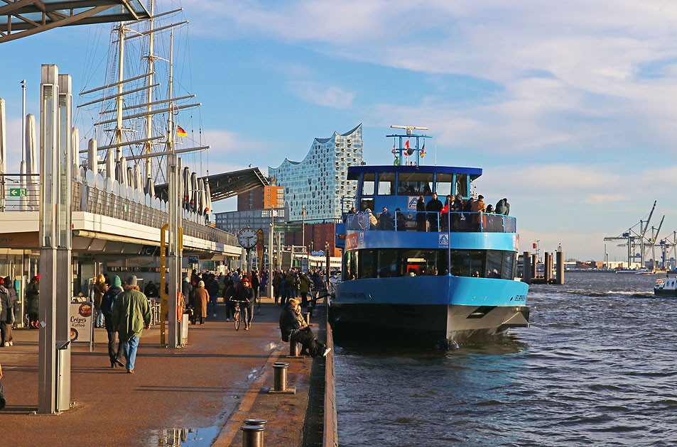 Das hier ist in Hamburg: Die HADAG-Fähre Elbphilharmonie hat soeben an den Landungsbrücken abgelegt und fährt als Linie 62 nach Finkenwerder. Rechts im Bild ein Abicht-Schiff und der Anleger von den Landungsbrücken. Digi Foto: IMG_0303.JPG Digi Fotos: 0368, FP10 (D15/D5/+#24) Foto: Lars Brüggemann |