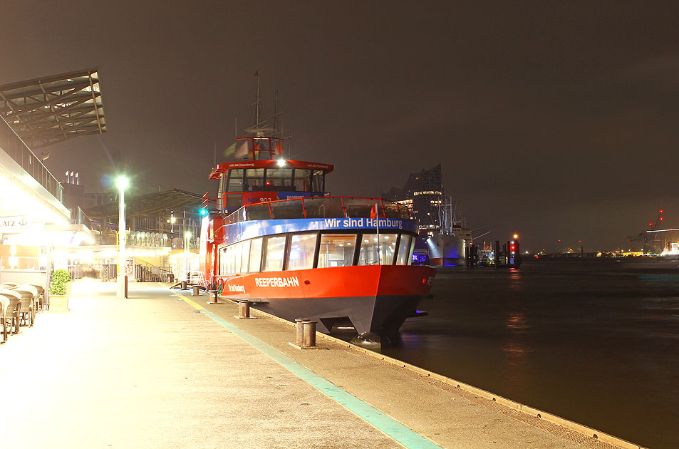 Das HADAG Schiff Reeperbahn wartet abends an den St. Pauli Laundungsbrücken als Linie 62 nach Finkenwerder auf die Abfahrtszeit. Die wenigen Fahrgäste in Richtung Finkenwerder haben bereits Platz genommen. Die HADAG-Fähren sind ein öffentliches Verkehrsmittel im HVV (Hamburger Verkehrsverbund). In der Mitte oben die Elbphilharmonie und rechts neben dem HADAG-Schiff die Cap San Diego. Die Reeperbahn wurde 1999 auf der Werft Heinrich Grube in Hamburg-Oortkaten gebaut. Digi Foto: IMG_6174.JPG Digi Fotos: 0374, FP10 (D3/D11/+#24) Foto: Lars Brüggemann |