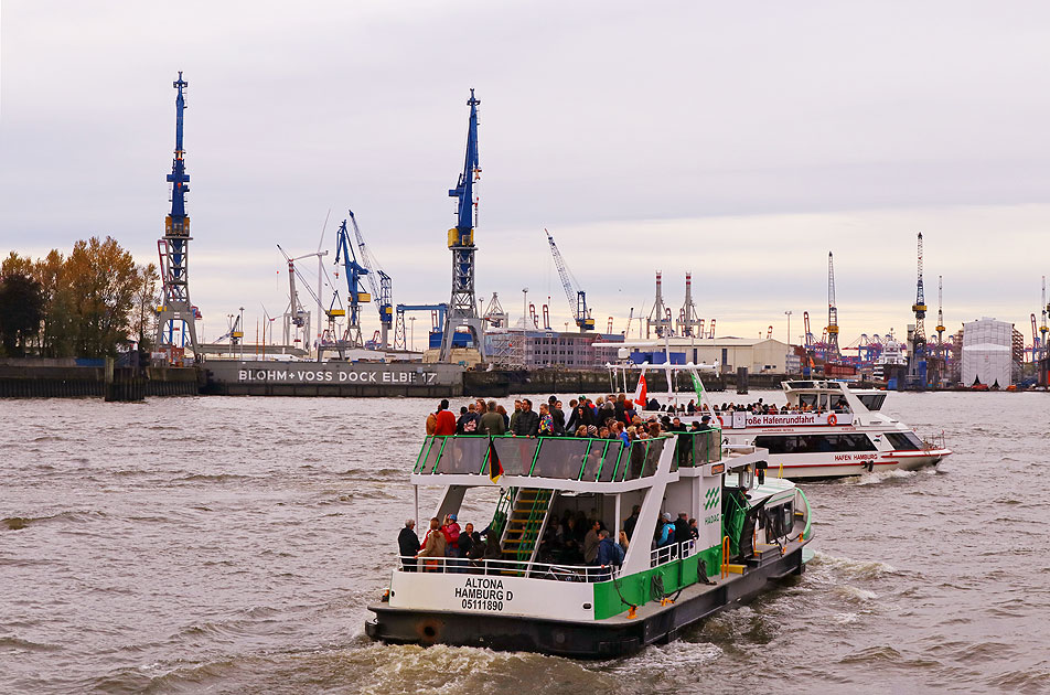 Das HADAG-Schiff Altona verlässt den Anleger St. Pauli Landungsbrücken in Hamburg auf der Elbe als Linie 62 nach Finkenwerder. Das HADAG-Schiff Altona, ein Schiff der Klasse Typ I. Die Altona wurde 1989 auf der Heinrich Grube Schiffswerft gebaut. Das Schwesterschiff der Altona war die Finkenwerder III. Hinten links die Traditionswerft Blohm+Voss. Digi Foto: IMG_9565.JPG Digi Fotos: 0373, FP10 (D20/D10/#+24) Foto: Lars Brüggemann |