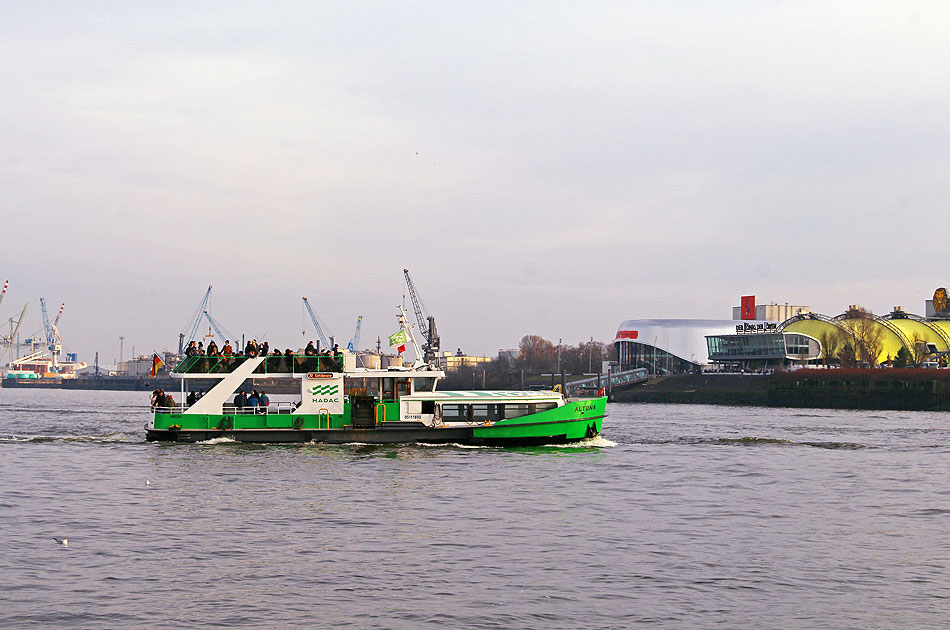 Das HADAG-Schiff Altona verlässt den Anleger St. Pauli Landungsbrücken in Hamburg auf der Elbe als Linie 72 zur Elbphilharmonie. Das HADAG-Schiff Altona, ein Schiff der Klasse Typ I. Die Altona wurde 1989 auf der Heinrich Grube Schiffswerft gebaut. Das Schwesterschiff der Altona war die Finkenwerder III. Hinten rechts die beiden Musical-Theater im Hafen. Die Linie 72 bietet sich übrigens auch als Mini-Hafenrundfahrt für Touristen die es eilig haben an. In etwa 30 Minuten fährt man mit der 72 von den Landungsbrücken zur Elbphilharmonie und zurück. Bei der HADAG gelten HVV-Fahrkarten, so auch das Deutschlandticket. Wer aber Zeit und Geld hat, dem sei eine richtige Hafenrundfahrt empfohlen. Digi Foto: IMG_7966.JPG Digi Fotos: 0377, FP10 (D22/D2/#+25) Foto: Lars Brüggemann |