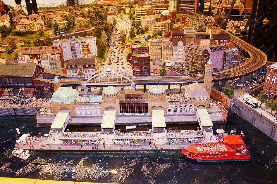 Ein Besuch im Hamburger Miniatur Wunderland (Miwula) geht natürlich immer. Und bei Regenwetter ist der Besuch optimal, denn im Miwula ist es warm, trocken, überdacht und klimatisiert. Hier auf dem Foto die Landungsbrücken im Hamburg-Abschnitt, links der Bahnhof Baumwall rechts unten eine HADAG-Fähre. Dies ist alles nicht vorbildgerecht, aber man erkennt sofort das die Hamburger Landungsbrücken sind. Das Miwula liegt in der Hamburger Speicherstadt und ist gut mit dem Bus bis Auf dem Sande oder Am Sandtorkai und der Hochbahn (U-Bahn) bis Baumwall zu erreichen. Digi Foto: IMG_0649.JPG Digi Fotos 0382, FP10 (D9/D7/#+25) Foto: Lars Brüggemann |