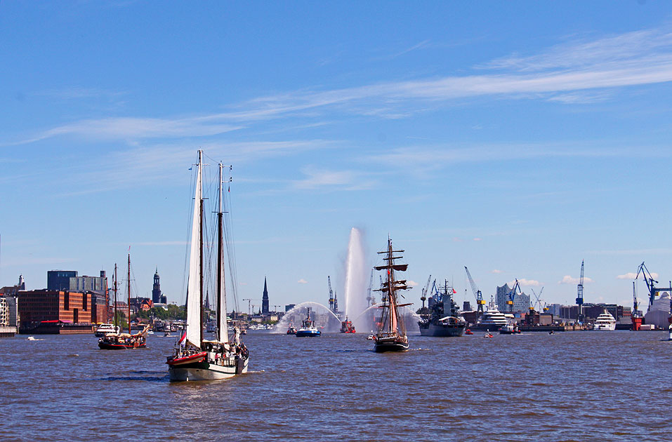 Die Einlaufparade mit vielen Segelschiffen im Bild zum Hamburger Hafengeburtstag. Hier geht die Fahrt auf der Elbe direkt in Richtung Landungsbrücken. Oben links der Michel und oben rechts die Elbphilharmonie. Die Einlaufparade zum Hafengeburtstag ist ein ganz besonderes Ereignis. Entlang der Elbe ist da schon viel los, überall stehen oder sitzen Schaulustige. Aber vom Schiff aus hat man wohl die Beste Sicht. Digi Foto: IMG_0346.JPG Digi Fotos: 0380, FP10 (D9/D5/#+25) Foto: Lars Brüggemann |