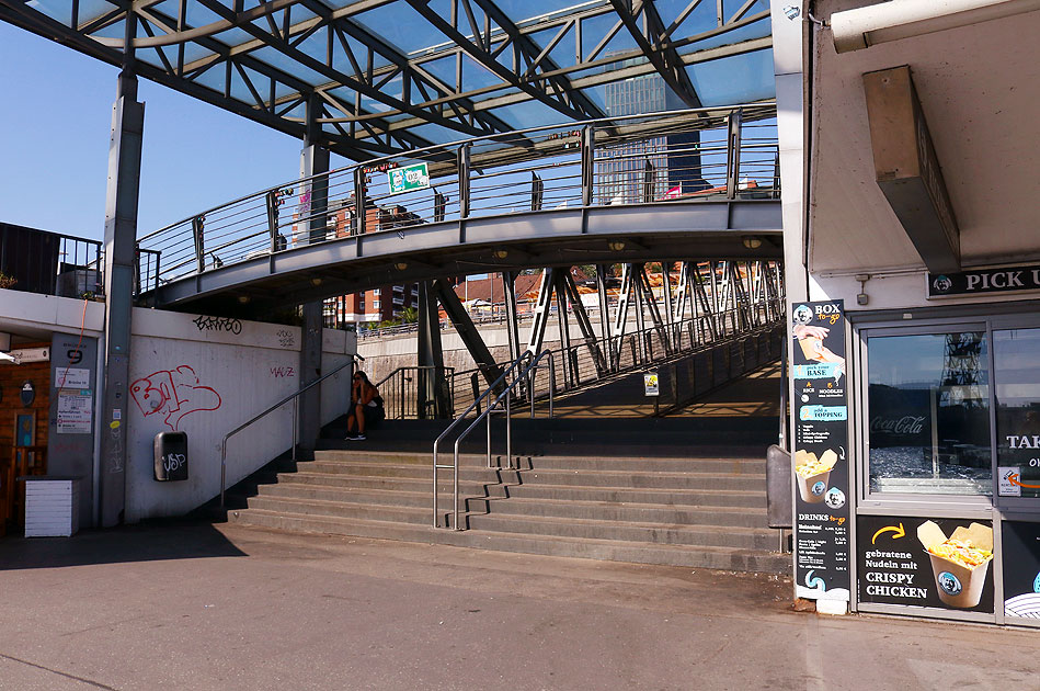 Dies hier ist die Brücke 9 an den St. Pauli Landungsbrücken in Hamburg. Rechts im Bild der Imbiss von Ricebrothers. Die Brücke 9 is bereits am westlichen Ende der Landungsbrücken, noch westlicher ist nur noch die Brücke 10. Für einige sind die Treppen nur der Weg schnell auf den Anleger um ans Wasser zu kommen oder ein Fischbrötchen zu kaufen. Andere finden es prima auf der Treppe zu sitzen und von hier aus die Elbe und die Landungsbrücken zu genießen. Links und rechts der Treppe: Abfallbehälter! Digi Foto: IMG_1284.JPG Digi Fotos: 0372,FP10 (D6/D9/#+24) Foto: Lars Brüggemann |
