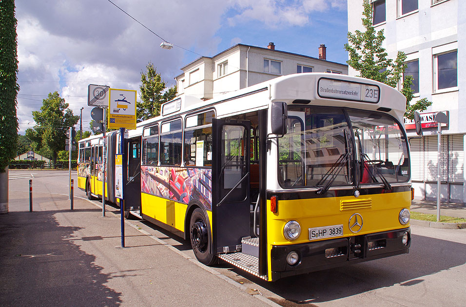Der SSB-Bus 7453 vor dem Stuttgarter Straßenbahnmuseum als Straßenbahnersatzverkehr für einen Museumswagen der Straßenbahn. Dieser Bus ist ein Mercedes-Benz O 305 G mit dem Baujahr 1984. Digi Foto: IMGP7252.JPG Digi Fotos: 0251, FP3 (D24/D8/#+14) Foto: Lars Brüggemann |