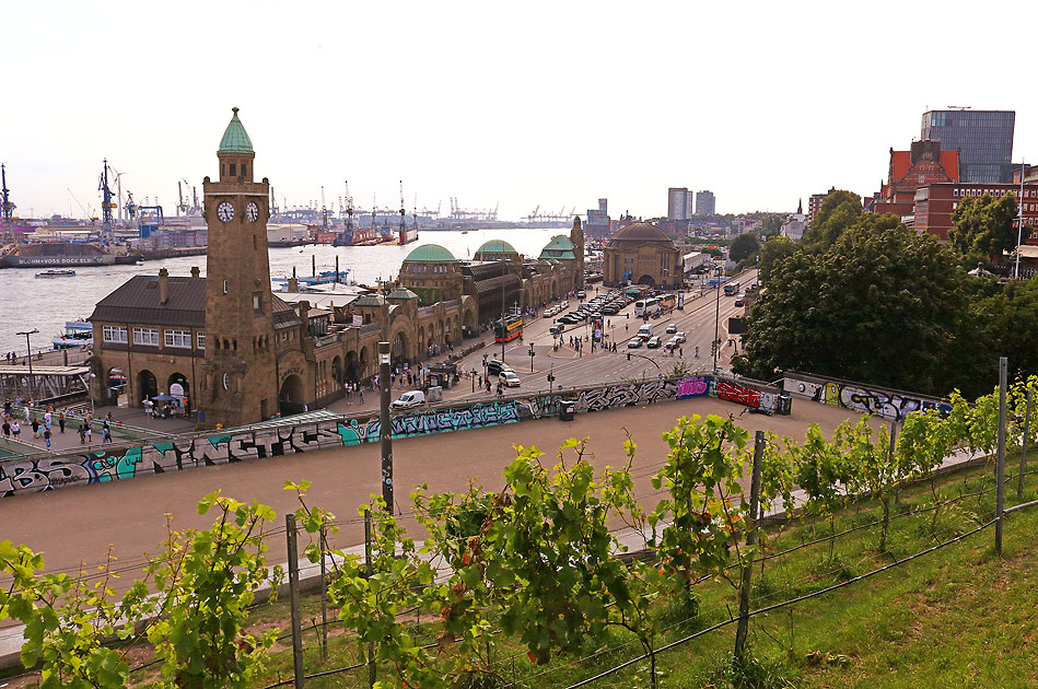 Oben auf dem Stintfang an den St. Pauli Landungsbrücken in Hamburg. Mittig links das Abertigungsgebäude der Landungsbrücken. Links oben der Pegelturm. In der Mitte der Zugang zum Alten Elbtunnel. Unten der Weinberg auf dem Stintfang. Von hier oben hat man eine wunderbare Aussicht auf die Landungsbrücken, den Hafen und die Elbe. An den Landungsbrücken treffen sich zahlreiche Verkehrsmittel: Die U-Bahn, die S-Bahn, Busse und Schiffe. Von hier aus startet man Hafenrundfahrten, fährt nach Helgoland oder mit der HADAG nach Finkenwerder. Digi Foto: IMG_4108.JPG Digi Fotos: 0370, FP10 (D19/D7/#+24) Foto: Lars Brüggemann |