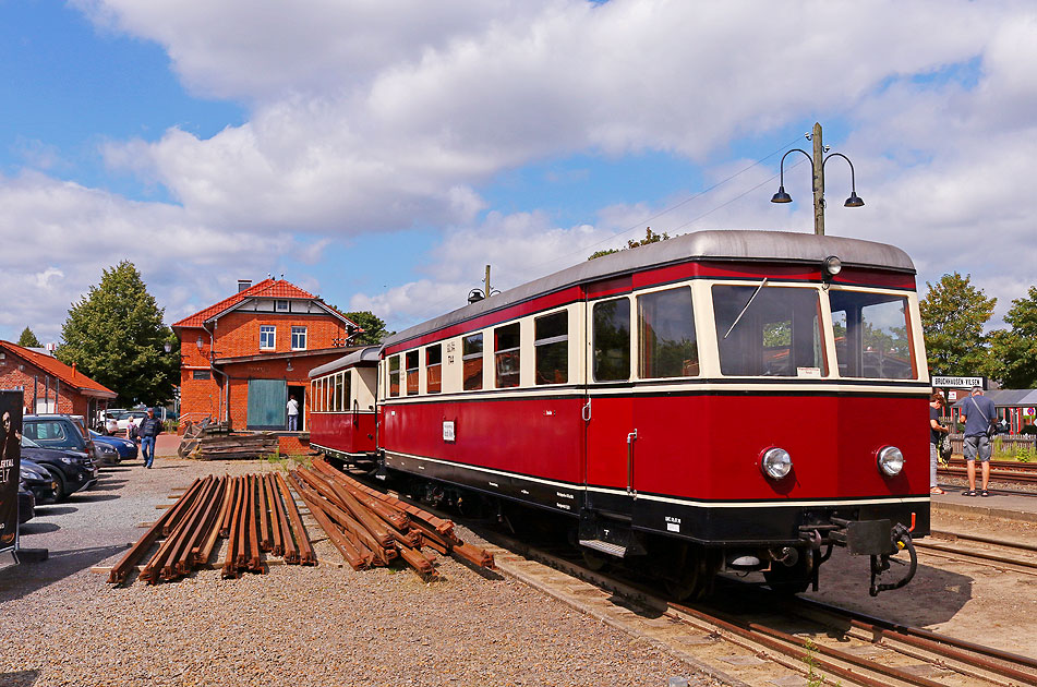 Die Museumseisenbahn von Bruchhausen-Vilsen nach Asendorf: Im Bahnhof Bruchhausen-Vilsen wartet auf dem Gleis 1 der T 44 vom DEV auf die planmässige Abfahrtszeit als Personenzug nach Asendorf. Der T 44 wurde 1950 von Talbot mit der Fabriknummer 94429 an die Euskirchener Kreisbahn AG geliefert. Von der Euskirchener Kreisbahn ging der Triebwagen an die Inselbahn Juist und von dort 1982 zum DEV. Links im Bild ein hochmoderner Zugzielanzeiger, dieser wird manuell bedient und funkitoniert auch bei Stromausfall. Digi Foto: IMG_4533.JPG Digi Fotos: 0347 (D7/D8/+#22) Foto: Lars Brüggemann Interner Vermerk: Dieses Foto ist noch unter einem anderen Dateinamen online. Diese Seite ist ein Teil einer Online-Foto-Sammlung ähnlich einem Bildband, Sie können sich hier von Seite zu Seite durchklicken. Vielleicht suchen Sie aber Fotos für eine Heimatchronik, ein Fachbuch oder einen Fachartikel? Schreiben Sie mir! Email an Lars Brüggemann: mail@larsbrueggemann.de Dieses Angebot richtet sich nicht an Bildersammler zur kostenlosen Zusendung (für "private Zwecke"). Ebenso bitte ich um Verständnis das ich als Journalist keine kostenlosen Fotos für Veröffentlichungen anbiete (selbst bei so verheißungsvollen Angeboten wie: "selbstverständlich schreiben wir auch Ihren Namen dazu"). Es hilft auch nicht wenn Sie Fotos umsonst bekommen möchten, eine Anfrage so schwammig zu formulieren, dass aus dieser nicht hervor geht ob Sie zahlen wollen oder eben nicht. Ebenso biete ich keinen Versand von Originaldateien weder kostenlos noch gegen Bezahlung für Privatpersonen an, dieses Angebot beschränkt sich marktüblich auf den journalistischen Bereich. Bitte haben Sie Verständnis das Anfragen für kostenlose Fotos gewöhnlich nicht mehr beantwortet werden. Warum ich keine kostenlosen Fotos anbiete lesen Sie hier... zurück zur: Startseite |