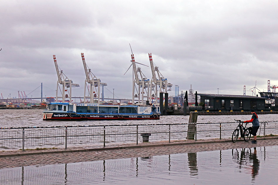 Wenn eine Sturmflut nach Hamburg kommt, dann steht der Fischmarkt gewöhnlich unter Wasser. Doch das Hochwasser und das bald das Wasser ganz am Fischmarkt überlaufen könnte, das stört die Barkase Hugo Abicht nicht! Die Barkasse Hugo Abicht kümmert das recht wenig und fährt für seine Fahrgäste ganz nah an den Fischmarkt ran. Hinten im Bild einige Hafenkräne. Vorne unten im Bild ist es schon nass auf dem Fischmarkt, aber noch kann man an die Elb ganz nah ran ohne nass zu werden. Digi Foto: IMG_0522.JPG Digi Fotos: 0385, FP10 (D5/D10/+#25) Foto: Lars Brüggemann |