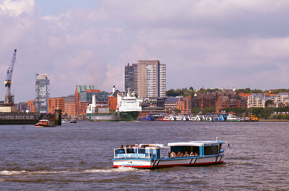 Die Aussicht an den St. Pauli Landungsbrücken in Hamburg: Das Schiff Willi Abicht von Rainer Abicht fährt hier über die Elbe vorbei an den St. Pauli Landungsbrücken. Links oben die Elbphilharmonie und dadrunter die Cap San Diego. Digi Foto: IMG_3327.JPG Digi Fotos: 0373, FP10 (D18/D10/+#24) Foto: Lars Brüggemann |