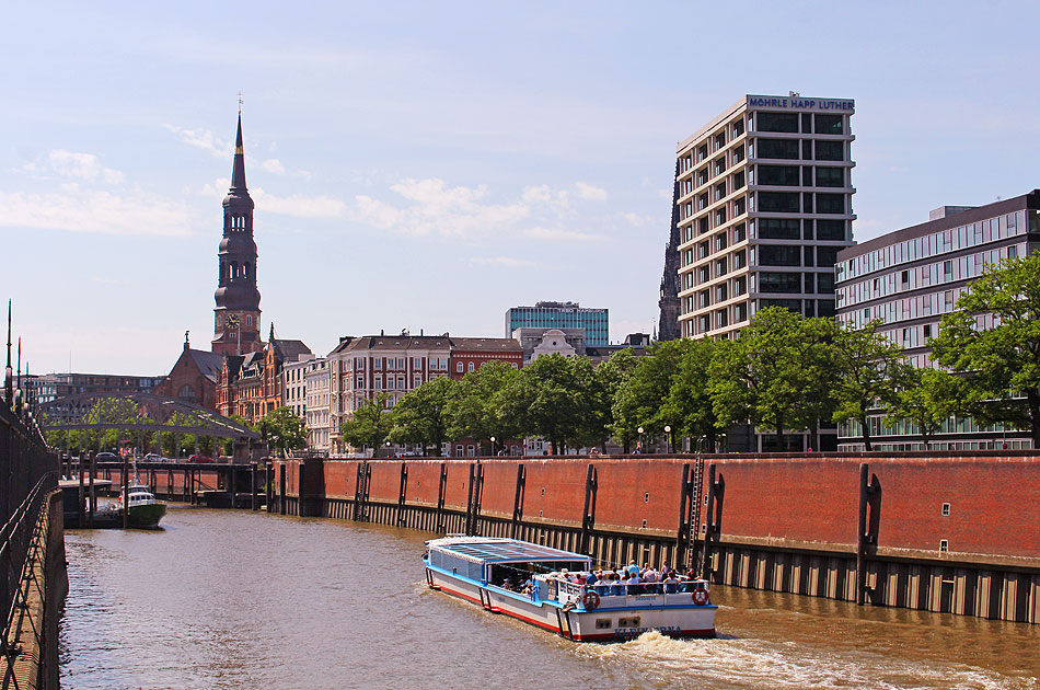 Die Barkasse Klein Erna von der Rainer Abicht Elbreederei GmbH & Co. KG ist unterwegs auf Hafenrundfahrt mit der Speicherstadt. Die Klein Erna fährt hier durch den Zollkanal in Richtung Baumwall und Niederhafen. Oben im Bild die Hauptkirche St. Katharinen. Digi Foto: IMG_6314.JPG Digi Fotos: 0381, FP10 (D13/D6/+#25) Foto: Lars Brüggemann |
