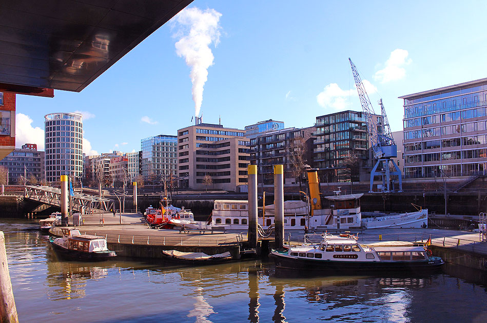 Der Museumshafen in der Hafencity zwischen Sandtorkai und Kaiserkai, rechts im Bild stehen alte Hafenkräne. Im Hintergrund sind die Magellan-Terrassen zu sehen. Hinten in der Bildmitte der Ellipsenturm. Digi Foto: IMGP9440.JPG Digi Fotos: 0272, FP3 (D1/D5/D2016) Foto: Lars Brüggemann |