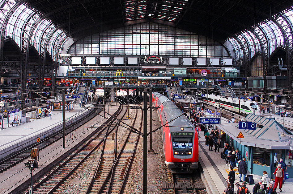Die Bahnhofshalle vom Hamburger Hauptbahnhof. Umsteigebahnhof, Startbahnhof, Zielbahnhof. Am 6. Dezember 1906 wurde der Hamburger Hauptbahnhof eröffnet und ist heute nicht mehr wegzudenken. In der Bildmitte ein Eilzug nach Rostock Hbf über Schwerin Hbf. Rechts im Bild ein ICE-Schnellzug. Im Hintergrund die Wandelhalle, das große Einkaufszentrum im Hauptbahnhof, hier kann man auch sonntags einkaufen und essen. Digi Foto: IMG_3670.JPG Digi Fotos: 0379, FP10 (D29/D4/schiff25) Foto: Lars Brüggemann |