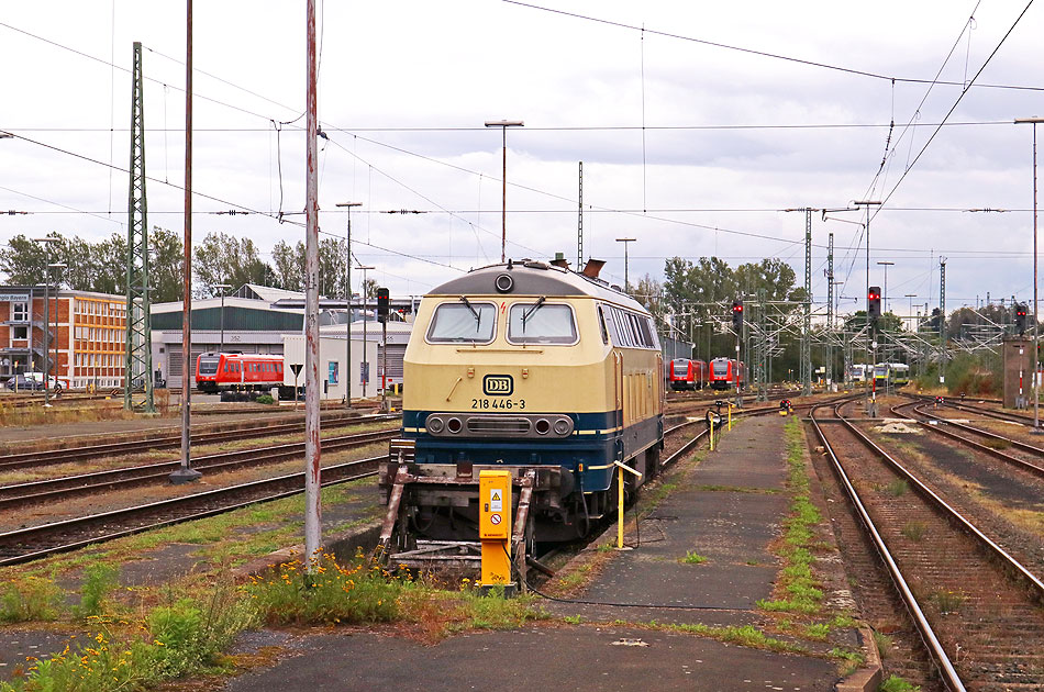 Die 218 446-3 ruht sich hier auf einem Abstellgleis in Hof Hbf aus und wartet geduldig auf ihren nächsten Einsatz. Hof ist eine Stadt in Nordosten von Bayern und eigentlich in Franken an der Saale. Von 1949 bis 1990 war Hof ein Grenzbahnhof von der BRD (Bundesrepublik Deutschland) zur DDR (Deutsche Demokratische Republik). Digi Foto: IMG_6147.JPG Digi Fotos: 0372, FP10 (D25/#9/#24) Foto: Lars Brüggemann Interner Vermerk: Dieses Foto ist noch unter einem anderen Dateinamen online. |