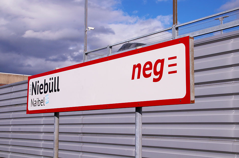 Ein Bahnhofsschild auf dem Bahnsteig vom Bahnhof Niebüll NEG. Wie es für Nordfriesland gehört, steht der Ortsname Niebüll auch auf friesisch dran: Naibel. Digi Foto: IMG_5271.JPG Digi Fotos: 0324 (D7/D9/nordsee20) Foto: Lars Brüggemann |