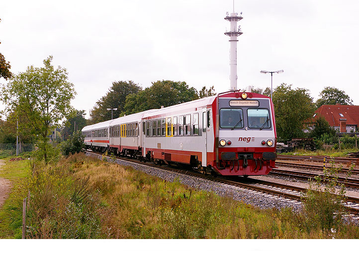 Am 20. September 2008 kommt der NEG T 4 in Niebüll aus Dagebüll kommend eingefahren. Hinter dem Triebwagen der NEG-Steuerwagen und dahinter zwei IC-Kurswagen. Digitalfoto: IMGP6313.JPG Digi Fotos 0178 Fotos: Lars Brüggemann |