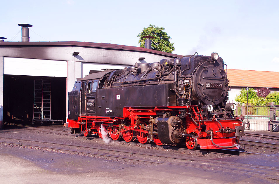 In den 1980er Jahren gab es in Westdeutschland einen Aufkleber für Eisenbahnfreunde mit der Aufschrift: "Dampfkraft ja bitte". Die 99 7235-7 der Harzer Schmalspurbahnen im Bw Wernigerode, aufgenommen an einem warmen Sommertag. Diese Dampflok wurde als 99 235 1955 mit der Fabriknummer 134012 vom Lokomotivbau Karl Marx Babelsberg an die Deutsche Reichsbahn ausgeliefert. Die Umzeichnung zur 99 7235-7 erfolgte 1970. Digi Foto: IMGP7932.JPG Digi Fotos: 0237 (D10/D6/dampf13) Foto: Lars Brüggemann Interner Vermerk: Dieses Foto ist noch unter einem anderen Dateinamen online. Diese Seite ist ein Teil einer Online-Foto-Sammlung ähnlich einem Bildband, Sie können sich hier von Bahnhof zu Bahnhof durchklicken. Vielleicht suchen Sie aber Fotos für eine Heimatchronik, ein Fachbuch oder einen Fachartikel? Schreiben Sie mir! Email an Lars Brüggemann: mail@larsbrueggemann.de zurück zur: Startseite |