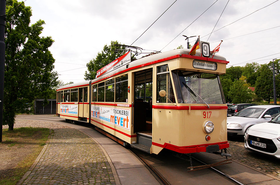 In der Kehrschleife von der Endhaltestellle Sebaldsbrück in Bremen steht der BSAG-Museumswagen 917. Dieser Wagen heisst Ackerwagen und ist ein ganz besonderer Straßenbahnwagen. Dieser Wagen ist nämlich ein Dreiachser, der Vorderteil hat zwei Achsen und das Hinterteil nur eine Achse. Wegen seiner schlechten Laufeigenschaften bekamen diese Wagen den Namen: "Ackerwagen". Der Wagen 917 wurde 1957 gebaut und war bis 1977 im Einsatz. Heute ist der Wagen eines der besonderen Schmuckstücke im Bremer Straßenbahnmuseum und ein Stück Bremer Stadtgeschichte. Digi Foto: IMG_4205.JPG Digi Fotos 0356 (D14/D5/#+23) Foto: Lars Brüggemann Interner Vermerk: Dieses Foto ist noch unter einem anderen Dateinamen online. |