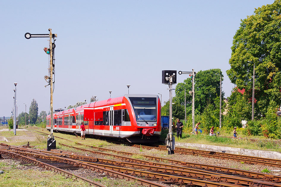 Lars Brüggemann, Themen-Nummer: 421 DB Regio fuhr nach Polen Am 26. August 2011 präsentierte DB Regio Nordost gemeinsam mit Arriva Polen die nun für Polen zugelassenen DB-Triebwagen der Baureihe 646. Eine Sonderfahrt führte von Berlin nach Landsberg (Gorzow) und Meseritz (Miedzyrzecz) im heutigen Polen. Mit rund 90 Fahrgästen und zahlreichen Ehrengästen fuhr DB Regio den damals ersten Sonderzug nach Polen mit einem 646, darunter Jörg Vogelsänger, Minister für Infrastruktur und Landwirtschaft des Landes Brandenburg, Maciej Szykula, Marschall der Wojewodschaft Lubuskie, Dr. Joachim Trettin, Konzernbevollmächtigter der Deutschen Bahn AG für das Land Brandenburg und Damian Grabowski, Geschäftsführer von Arriva in Polen. Die Fahrt war nun möglich da die DB-Triebwagen auch eine Zulassung für Polen haben und sie nun über alle polnischen Sicherheitsausrüstungen verfügen. Nach einem aufwendigen Umbau- und Anpassungsprozess haben DB Regio und Arriva RP die offizielle Zulassung durch das UTK in Warschau, der Aufsichtsbehörde in Polen, erhalten, Dieseltriebwagen der Baureihe 646 im grenzüberschreitenden Verkehr zwischen Deutschland und Polen einzusetzen. Wunsch war es, bessere Verbindungen zwischen Deutschland und Polen zu schaffen, da dies mehr Fahrgäste auf die Schiene bringen würde. Derzeit fährt noch die Niederbarnimer Eisenbahn von Berlin nach Küstrin (Kostrzyn) in Polen, zur Weiterfahrt in die nächste größere Stadt Landsberg an der Warte (Gorzow) muss man noch umsteigen, dies sollte mit den DB-Triebwagen entfallen, wenn die DB die nächste Ausschreibung zusammen mit dem Verkehr nach Polen gewonnen hätte. „Der Zuspruch für die erste angebotene Regio-Tour war überwältigend und bestätigt einmal mehr das große Interesse unserer Reisenden an einer Verbesserung der grenzüberschreitenden Verkehre zwischen beiden Ländern. Aus diesem Grund freue ich mich, mit den jetzt auch in Polen zugelassenen Triebwagen touristisch-interessante Verkehre anbieten zu können“, erläuterte Dr. Joachim Trettin auf der Regio-Tour. DB Regio Nordost und Arriva RP planen, nach Polen künftig weitere Regio-Touren anzubieten und wird sich auch weiterhin für einen Schienenpersonennahverkehr in die polnische Grenzregion engagieren. Vor dem Planverkehr möchte man zunächst im touristischen Verkehr aktiv sein, eine nächste Fahrt ist nach Kolberg geplant. |