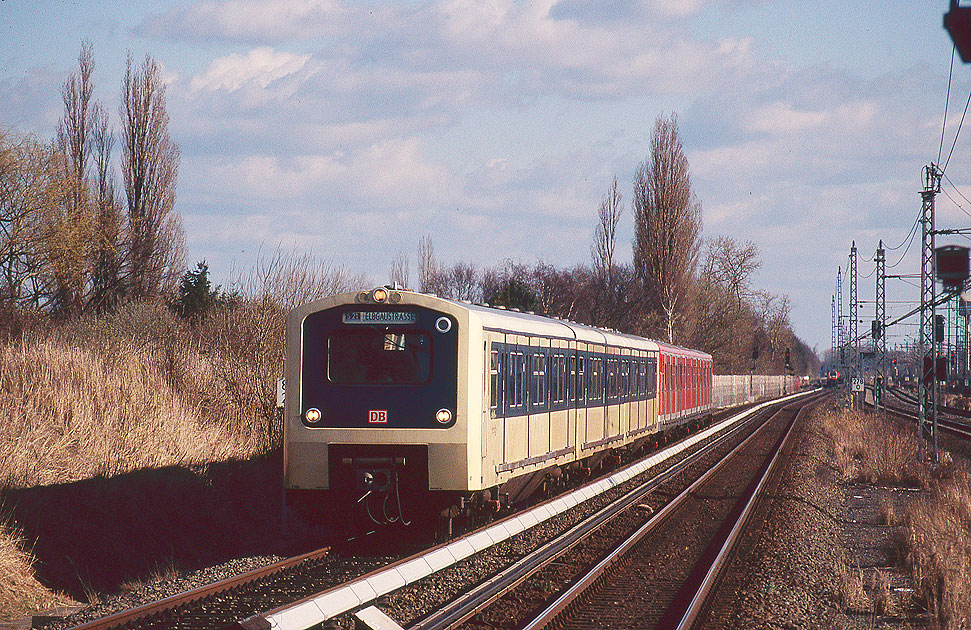 Am 25. März 2004 kommen die 472 560 (260) und 230 vom Bahnhof Mittlerer Landweg in den Bahnhof Billwerder Moorfleet gefahren. Auf dem Foto sieht man mit dem vorderen 472 die klassische Farbgebung der Baureihe 472 in beige/blau, der hintere 472 in rot. Dia 7668-2 FP5 Foto: Lars Brüggemann Interner Vermerk: Dieses Foto ist noch unter einem anderen Dateinamen online. |