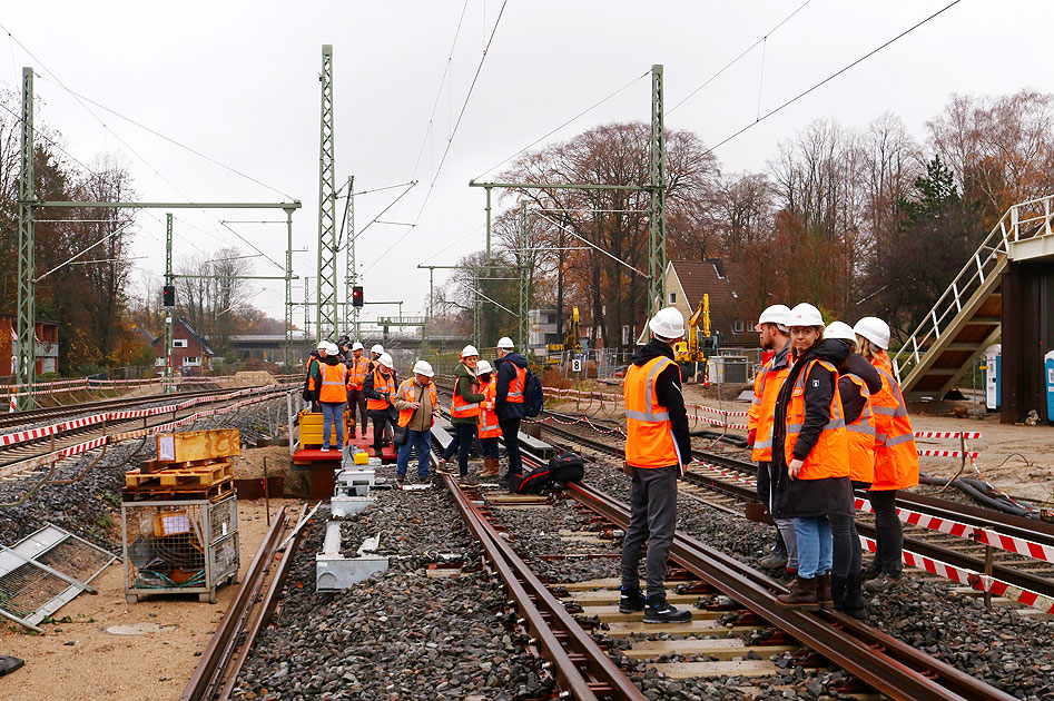 Lars Brüggemann, Hamburg Baufortschritt bei Hamburger S4 Am 20. November 2023 informierte die Deutsche Bahn über den Baufortschritt für die zukünftige S4 von Hamburg nach Ahrensburg. Für die zukünftige S-Bahn-Strecke die am Bahnhof Hasselbrook ausgefädelt wird, sind die ersten 3 Kilometer-Gleise verlegt und die Arbeiten für die dafür verschwenkten Fernbahngleise sind am Laufen. Die Bauarbeiten für die neue S-Bahnstrecke S4 sind am Laufen. Dafür wurden im Bereich der Baustelle zwischen den Bahnhöfen Hasselbrook und der Claudiusstraße bereits 13 neue Oberleitungsmasten aufgestellt und rund 2.000 Meter Fahrdraht eingehängt. Insgesamt braucht es für die Elektrifizierung der S4 künftig 30 neue Strommasten und rund 5.000 Meter Leitung.eben der Elektrifizierung wurden zudem drei Kilometer neue Gleise für die S-Bahn und Fernbahn verlegt, sowie zehn neue Weichen verbaut und auf 400 Metern neue Lärmschutzwände aufgestellt. Im kommenden Jahr stehen die Bauarbeiten an der Bovestraße im Fokus, wo unter anderem zwei neue Brücken eingesetzt werden sollen. Dort muss der Bestand erneuert werden, um künftig vier anstatt der bisherigen drei Gleise über die Straße zu führen. Zudem werden auf mehr als zwei Kilometern Strecke neue Lärmschutzwände aufgebaut. Die S-Bahn-Strecke soll zwei ESTW (Elektronisches Stellwerk) bekommen, das ESTW Hasselbrook an der Ausfädelung soll bereits im Januar 2024 in Betrieb gehen. Die DB-Gesamtprojektleiterin Amina Karam sagte: „Wir kommen sehr gut voran, bündeln Maßnahmen und optimieren die Planung wo immer es geht, um zügig bauen zu können. Die Zahl der Fahrgäste im Regionalverkehr steigt seit Jahren.“ Nach den Plänen der DB, soll ab 2027 die S4 bis Hamburg-Rahlstedt fahren, ab 2029 bis Ahrensburg und Bad Oldesloe. Zusätzlich zu der neuen S-Bahn-Strecke baut die DB fünf neue Bahnhöfe an der Strecke. Die Investitionskosten liegen bei rund 1,8 Milliarden Euro. |