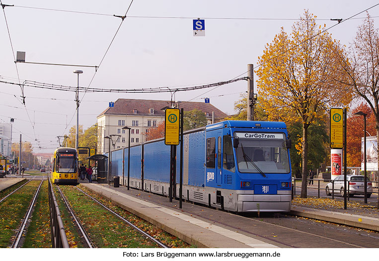 Mit Elektromobilität durch Dresden: Die DVB-Cargotram (Güter-Straßenbahn) hat soeben die Gläserne Manufaktur verlassen und fährt durch die Haltestelle Straßburger Platz. Digi Foto: IMGP0033.JPG Digi Fotos: 0265 (D29/D10/#+15) Foto: Lars Brüggemann |