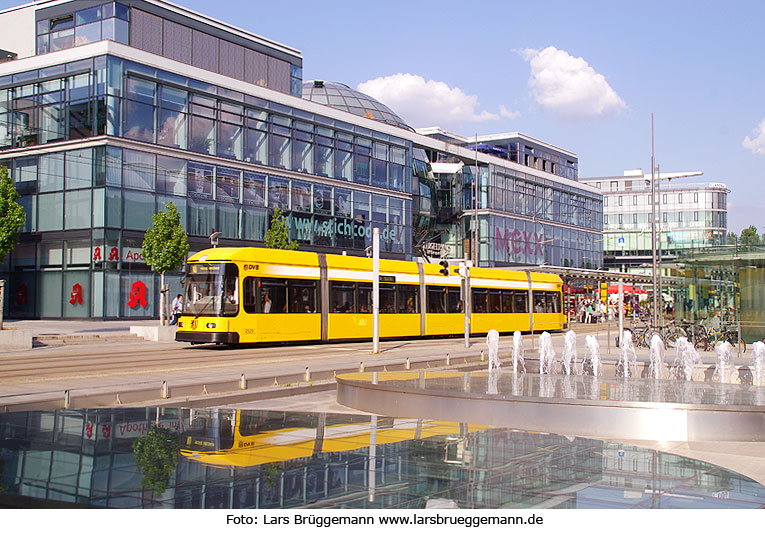 Mit Elektromobilität durch Dresden: Der Dresdener Straßenbahnwagen DVB 2529 auf der Linie 10 zur Messe verlässt die Haltestelle Hauptbahnhof in Dresden in Richtung Haltestelle Budapester Straße. Rechts plätschert ein Brunnen und unten links spiegelt sich die Straßenbahn. Digi Foto: IMGP1146.JPG Digi Fotos: 0238 (D18/D7/#+13) Foto: Lars Brüggemann |