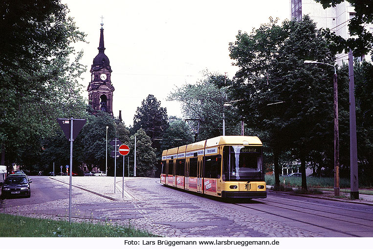 Mit Elektromobilität durch Dresden: Der DVB 2512 in Dresden zwischen der Permoserstraße und Trinitatisplatz aufgenommen am 10. Juni 2002. Oben links im Bild der Kirchturm der Dresdener Trinitatiskirche. Dia 19.025 Foto: Lars Brüggemann www.larsbrueggemann.de |