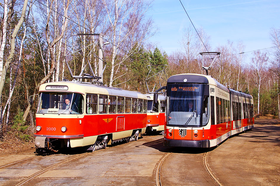 (block/7/#+26) Mit Elektromobilität durch Dresden: Der DVB Tatra-Wagen 2000 (links) und der DVB 2625 im Tatra-Design (rechts) in der Gleisschleife Diebsteig nördlich der Haltestelle Hellersiedlung. Die Gleisschleife Hellersiedlung ist nicht mehr in Betrieb. Digi Foto: IMG_2915.JPG Digi Fotos: 0282 (D4/D3/tatra17) Foto: Lars Brüggemann |