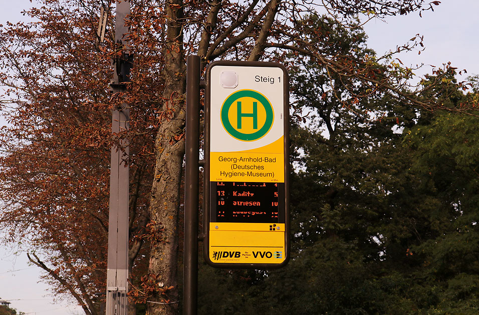 Ein Haltestellenschild der Haltestelle Georg-Arnhold-Bad der Straßenbahn in Dresden. Digi Foto: IMG_4767.JPG Digi Fotos: 0372 (D23/D9/+#24) Foto: Lars Brüggemann |