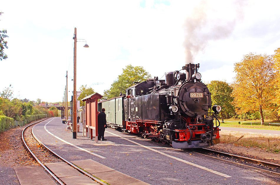 Die Dampflok 99 713 hält mit einem Personenzug (in Fachkreisen auch Regionalbahn genannt) von Radeul Ost nach Moritzburg im Bahnhof Friedewald Bad. Diese Dampflok ist eine sächsische VI K, ausgesprochen Vier K. Sie wurde 1927 von Hartmann an die Deutsche Reichsbahn geliefert. 1970 wurde sie zur 99 1713-9, doch die Nummer trug sie nicht so lange. 1975 wurde sie zur Traditionslok und erhielt wieder die Nummer 99 713. Digi Foto: IMG_2088.JPG Digi Fotos: 0385, FP10 (D21/D10/dampflok25) Foto: Lars Brüggemann |