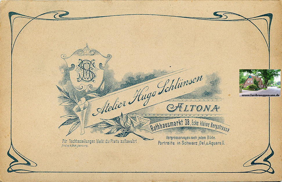 Ich stellte mir die Frage, was mache ich mit den Familienfotos aus meiner Familie? Viele solcher Fotos enden in Ebay-Auktionen und werden zerpflückt einzeln verkauft und verenden erstmal in irgendwelchen Sammlungen. Leider weiss ich zu den meisten Fotos auch nichts mehr, häufig nicht mal wer die Personen auf den Fotos sind. Bei diesem Foto kann ich leider nur rätseln. Dies könnte wohl meine Ur-Großmutter aus Sülldorf sein, denn das Foto wurde im Atelier Hugo Schlünsen in Altona gemacht, denn es wurde in Altona und nicht in Hamburg aufgenommen und der andere Teil der Familie wohnte zu Zeiten des 1. WK und bis zum Beginn des 2. WK noch in Hamburg. Das Atelier Hugo Schlünsen war in Altona am Rathausmarkt 38 an der Ecke Kleine Bergstrasse. Das Foto wurde auf eine dicke Pappe geklebt, hinten ist noch vermerkt: "Für Nachbestellungen bleibt die Platte aufbewahrt". Foto: album2-foto1a FP8 Foto: Slg. Lars Brüggemann Diese Seite ist ein Teil einer Online-Foto-Sammlung ähnlich einem Bildband, Sie können sich hier von Baureihe zu Baureihe durchklicken. Vielleicht suchen Sie aber Fotos für eine Heimatchronik, ein Fachbuch oder einen Fachartikel? Schreiben Sie mir! Email an Lars Brüggemann: mail@larsbrueggemann.de zurück zur: Startseite |
