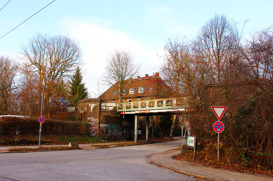 Die Brücke Reichsbahnstraße der Hamburger Güterumgehungsbahn in Hamburg-Eidelstedt, links im Bild der Kronsaalsweg, aufgenommen am 13. Dezember 2018. Linksmittig am Bildrand ist etwas unscheinbar die TRI 110 428-0. Digi Foto: IMG_6207.JPG Digi Fotos: 0303 Foto: Lars Brüggemann |