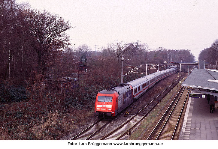 Wegen Bauarbeiten fährt die 101 133 mit einem IC über die Güterumgehungsbahn, hier am S-Bahn-Haltepunkt Hamburg-Rübenkamp aufgenommen am 27. Dezember 2007. Dia Foto: Lars Brüggemann larsbrueggemann.de 2.0 auf Facebook |