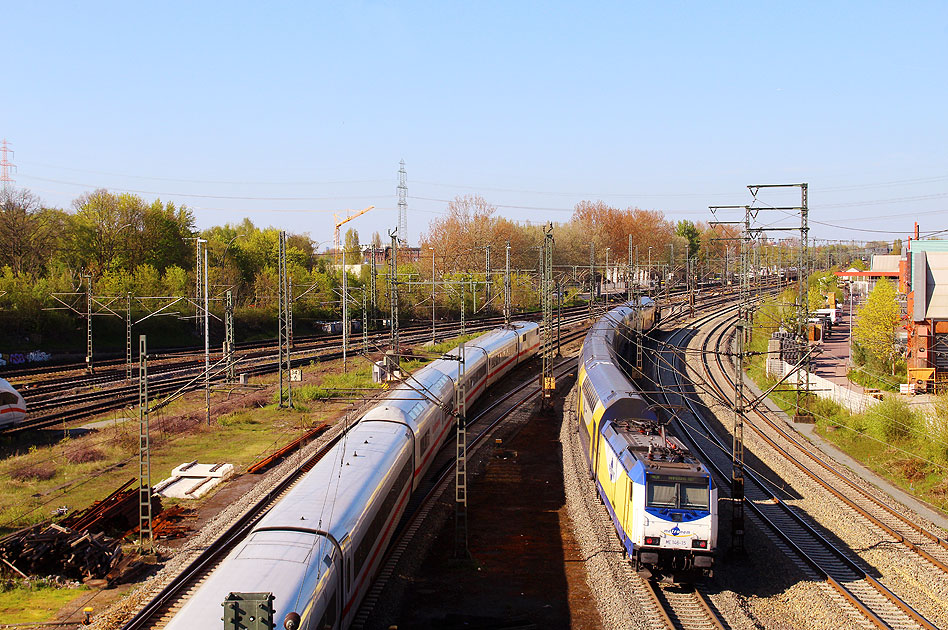 Den Bahnhof Hamburg-Harburg verlässt ein Metronom-Zug zum Hamburger Hauptbahnhof. Geschoben wird der Zug von der ME 146 - 15 (146 515). Links im Bild fährt ein ICE vom Hamburger Hauptbahnhof kommend in den Bahnhof Hamburg-Harburg ein. Digi Foto: IMG_3519.JPG Digi Fotos: 0355 (D30/D4/#+23) Foto: Lars Brüggemann Interner Vermerk: Dieses Foto ist noch unter einem anderen Dateinamen online. |