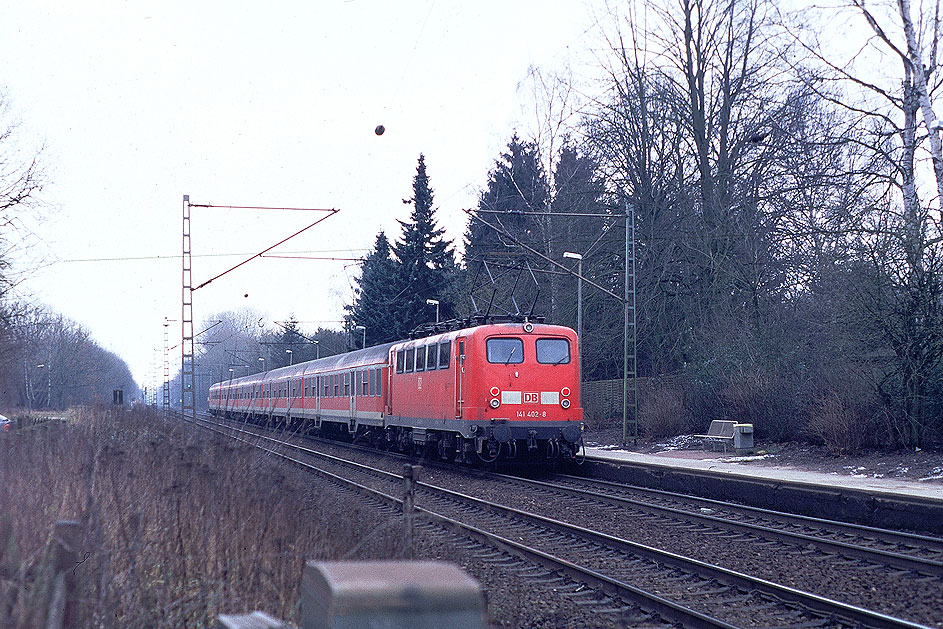 Die 141 402-8 mit einer Regionalbahn in Richtung Pinneberg in Prisdorf am 21. Februar 2005. Die 141 402-8 wurde gleich zum Jahresanfang 1966 mit der Fabriknummer 30953 von Henschel an die Deutsche Bundesbahn geliefert. Im Jahr 2006 erfolgte ihre z-Stellung nach einem Brandschaden und 2007 ihre Verschrottung. Dia U 19.162-1 FP8 BST: 1122 Foto: Lars Brüggemann Interner Vermerk: Dieses Foto ist noch unter einem anderen Dateinamen online. |