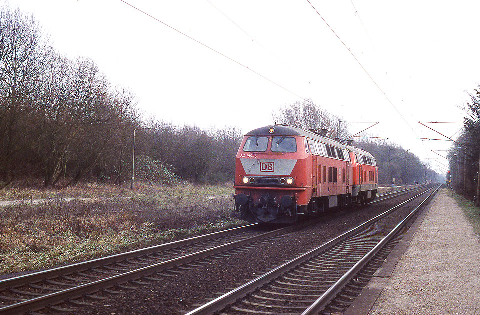 Durch den Haltepunkt Prisdorf der mal ein Bahnhof war fahren die 218 186 und 193 am 12. Januar 2001 als Lokzug in Richtung Elmshorn. Prisdorf ist ein Bahnhof zwischen Hamburg und Elmshorn. Dia 7584 FP8 Foto: Lars Brüggemann Interner Vermerk: Dieses Foto ist noch unter einem anderen Dateinamen online. |