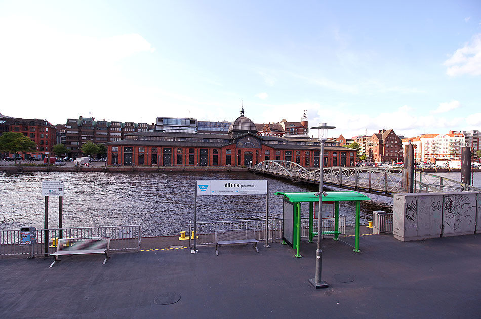 Der Schiffsanleger Altona (Fischmarkt) in Hamburg vom Schiff aufgenommen. Hinten in der Bildmitte die bekannte Fischauktionshalle. Rechts am Bildrand der Fischmarkt. Digi Foto: IMG_2574.JPG Digi Fotos: 0370, FP10 (D24/D7/#+24) Foto: Lars Brüggemann |
