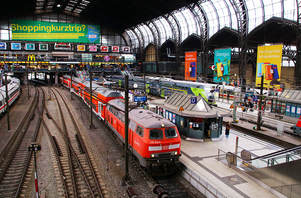 Bahnsteiggeknipse mit Histogramm in einer Richtung: Die 218 330-9 hatte am 30. Mai 2019 diesen Eilzug gebildet aus Doppelstockwagen von Puttgarden nach Hamburg Hbf geschoben. Nun räumt sie den Zug in den Abstellbahnhof aus der Bahnhofshalle von Hamburg Hbf ab. Digifoto: IMG_0371.JPG Digi Fotos 0309 Foto: Lars Brüggemann |