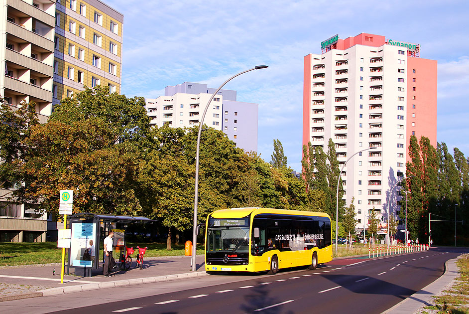 Mit Elektromobilität durch Berlin: Der BVG 1805, ein Solaris-Elektrobus vom Typ New Urbino, kommt als Buslinie 300 an die Haltestelle Lichtenberger Straße gefahren. Digi Foto: IMG_7679.JPG (D10/D8/#19) Digi Fotos: 0311 Foto: Lars Brüggemann Keywords: electric bus, bus electrique, elektriske bus, elektryczy autobus, autobus electrico, elektriska bussen, elektrisk buss, elektrikli otobüsü, autobusi elektrike |
