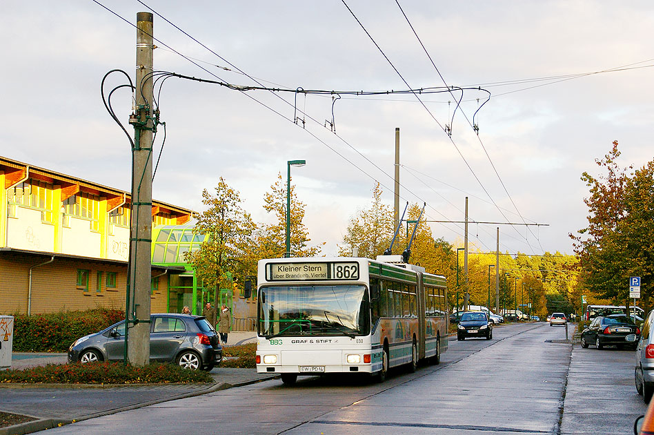 Mit Elektromobilität durch Eberswalde mit dem Strippenbus oder auch Strippenexpress: Der Eberswalder Obus von der BBG (Barnimer Busgesellschaft) 030 kommt im Brandenburgischen Viertel (vormals Wohnkomplex Max Reimann) von der Haltestelle Zum Specht und fährt gleich an die Haltestelle Potsdamer Allee. Digi Foto: IMGP2714.JPG (D13/D10/D2009) Digi Fotos: 0193 Foto: Lars Brüggemann Keywords: electric bus, bus electrique, elektriske bus, elektryczy autobus, autobus electrico, elektriska bussen, elektrisk buss, elektrikli otobüsü, autobusi elektrike Interner Vermerk: Dieses Foto ist noch unter einem anderen Dateinamen online. Diese Seite ist ein Teil einer Online-Foto-Sammlung ähnlich einem Bildband, Sie können sich hier von Haltestelle zu Haltestelle durchklicken. Vielleicht suchen Sie aber Fotos für eine Heimatchronik, ein Fachbuch oder einen Fachartikel? Schreiben Sie mir! Email an Lars Brüggemann: mail@larsbrueggemann.de Dieses Angebot richtet sich nicht an bildersammelnde Eisenbahnfreunde zur kostenlosen Zusendung (für "private Zwecke"). zurück zur: Startseite |