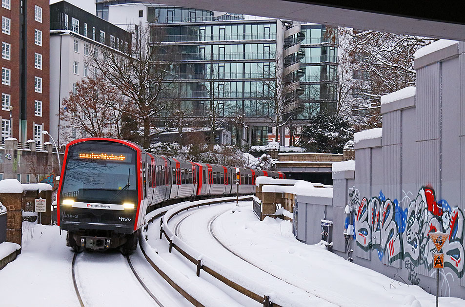 Während die große Bahn den Bahnverkehr wegen Schneefall in Norddeutschland vorsorglich eingestellt hatte, fuhr die Hamburger Hochbahn trotz Schnee unbeirrbar weiter! Hier am 9. Januar 2026 fahren zwei DT5, an der Spitze der 434-3, der Hamburger Hochbahn als Linie U3 vom Bahnhof St. Pauli in den Bahnhof Landungsbrücken ein. Digi Foto: IMG_6747.JPG Digi Fotos: 0388, FP10 Foto: Lars Brüggemann |