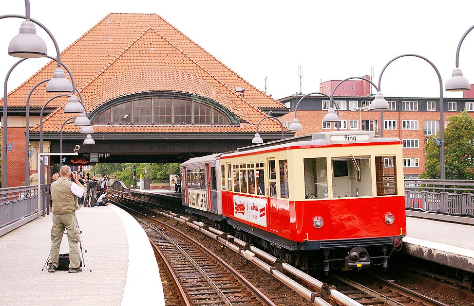 Der Bahnhof beziehungsweise die U-Bahn-Haltestelle Mundsburg der Hamburger Hochbahn, aufgenommen am 2. September 2008, auf dem obigen Foto fährt der "jüngste" Museumszug der Hamburger Hochbahn der TU 1 und TU 2. Am 2. September 2008 war es für die Hamburger Hochbahn soweit, ihre neuen Museumswagen der U-Bahn, je einen der Typen TU1 und TU2 der Öffentlichkeit vorzustellen. Die U-Bahnwagen von 1924 und 1927 wurden in den 1950er (TU 1) und 1960er Jahren (TU 2) umfassend modernisiert. Im Krieg wurden viele U-Bahn-Wagen zerstört und mussten neu aufgebaut werden. Viele in alter Form wurden als A-Wagen bezeichnet (die mit den zwei kleinen Fenstern an den Führerstandsseiten), die beiden „neuen“ Museumswagen sind neue Wagenkästen auf alten Untergestellen. Zunächst wurden die B-Wagen (TU 1) aufgebaut (sie hatten drei größere Fenster an den Führerstandsenden) und als letzte und neueste Version die „Silberlinge“ TU 2 mit zwei großen Fenstern. Die TU 2-Wagen zeichnen sich durch ihre silberne Nirosta-Außenverkleidung aus. 1970 wurden die letzten alten Wagen dann außer Dienst gestellt und vorerst von dem Hamburger Eisenbahnverein VVM (Verein Verkehrsamateure und Museumsbahn) erhalten. In liebevoller Detailarbeit haben Hochbahn-Mitarbeiter und Auszubildende der U-Bahn-Werkstätten die zwei Triebwagen restauriert und sie wieder in den Zustand der 50er und 60er Jahre zurückversetzt. „Wir sind sehr stolz, diese beiden historischen Mitglieder der U-Bahn-Flotte wieder in Fahrt gebracht zu haben. Damit sind alle Fahrzeugtypen seit 1912 wieder vollständig fahrtüchtig,“ freute sich Vorstandsmitglied Ulrich Sieg. Für die Hochbahn ist die Erhaltung und Pflege ihrer historischen Fahrzeuge heute ein Teil der „Unternehmensphilosophie“. |