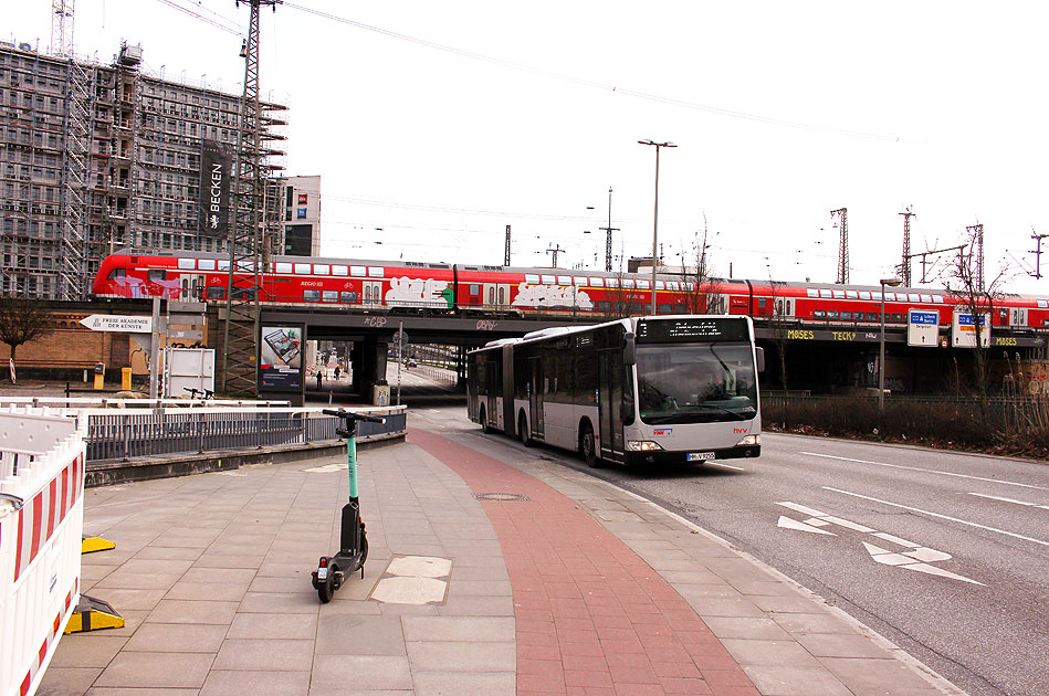 Dieses Foto zeigt den Hamburger Mobilitätsmix aus Bahn, Bus und Elektroroller: Oben im Bild fährt ein Doppelstockzug in den Hamburger Hbf, links unten ein Elektroroller und in der Bildmitte der VHH 1255. Der VHH-Citaro-Bus kommt gerade als Linie 3 nach Bahrenfeld Stadionstraße von der Haltestelle Spaldingstraße an die Haltestelle U-Bahn Steinstraße (Deichtorplatz) gefahren. Digitalfoto: IMG_1127.JPG Digi Fotos 0340 (D30/D1/x#22) Foto: Lars Brüggemann Diese Seite ist ein Teil einer Online-Foto-Sammlung ähnlich einem Bildband, Sie können sich hier von Haltestelle zu Haltestelle durchklicken. Vielleicht suchen Sie aber Fotos für eine Heimatchronik, ein Fachbuch oder einen Fachartikel? Schreiben Sie mir! Email an Lars Brüggemann: mail@larsbrueggemann.de Dieses Angebot richtet sich nicht an bildersammelnde Eisenbahnfreunde zur kostenlosen Zusendung (für "private Zwecke"). zurück zur: Startseite |