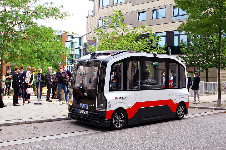 HEAT steht für: Hamburg Electric Autonomous Transportation. Der HEAT-Bus der Hamburger Hochbahn am 9. August 2021 an der Haltestelle Platz-der-Deutschen-Einheit in der Hamburger Hafencity. Die Haltestelle Platz-der-Deutschen-Einheit liegt nahe der Elbphilharmonie. Dieser Bus ist ein autonomer selbstfahrender Bus und natürlich auch ein Elektrobus. Die vielen Personen vor dem Bus sind nicht wie man denken könnte Fahrgäste sondern Gäste einer Presseveranstaltung. Der autonome Kleinbus wurde von der IAV (IAV GmbH Ingenieurgesellschaft Auto und Verkehr) entwickelt, verfügt über drei Sitz- und vier Stehplätze und ist für den barrierefreien Ein- und Ausstieg mit einer Rampe ausgestattet. Der Bus hat einen Elektroantrieb, der aus einer Hochvolt-Batterie mit Strom versorgt wird. Die Ladung erfolgt über Ladesäulen, die auf dem Gelände derWärme Hamburg GmbH sind. Digi Foto: IMG_6068.JPG Digi Fotos: 0335 Foto: Lars Brüggemann Diese Seite ist ein Teil einer Online-Foto-Sammlung ähnlich einem Bildband, Sie können sich hier von Haltestelle zu Haltestelle durchklicken. Vielleicht suchen Sie aber Fotos für eine Heimatchronik, ein Fachbuch oder einen Fachartikel? Schreiben Sie mir! zurück zur: Startseite |