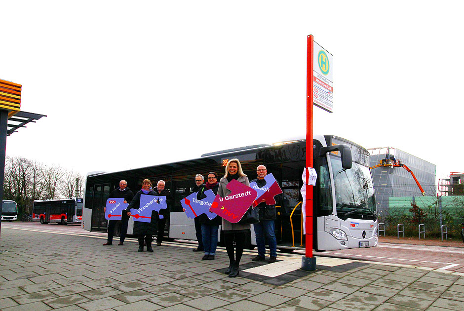 Am 8. Dezember 2021 machte die VHH einen Fototermin zur Einführung der neuen Buslinie 395 die ab dem Fahrplanwechsel am 12. Dezember 2021 fahren wird. Die neue Querverbindung von der Haltestelle S-Bahn Wedel nach U-Bahn Garstedt in Norderstedt verbindet die Gemeinden Appen-Etz, Rellingen, Tangstedt und Hasloh mit Umsteigemöglichkeit am Bahnhof Pinneberg an die S-Bahn und Regionalbahn. Vor dem Bus auf dem neuen Busbahnhof S-Bahn Pinneberg haben sich mit einem Puzzle alle wichtigen Entscheidungsträger für die neue Buslinie versammelt (von links nach rechts): Wedels Bürgermeister Niels Schmidt, Appens Bürgermeister Hans-Joachim Banaschak, Pinnebergs Bürgermeisterin Urte Steinberg, Claudius Mozer (SVG Südwestholstein ÖPNV-Verwaltungsgemeinschaft), Tangstedts Bürgermeisterin Henriette Krohn, Haslohs Bürgermeister Kay Löhr und Norderstedts Oberbürgermeisterin Elke Christina Roeder.
