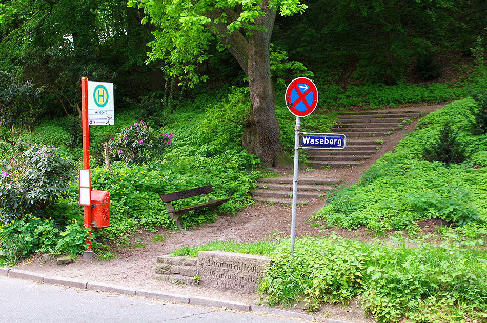 Die Bergziege in Hamburg-Blankenese: Hier die Bushaltestelle Waseberg der Bergziege, Buslinie 488 (vormals 48) mit einem Straßenschild Waseberg in Blankenese.