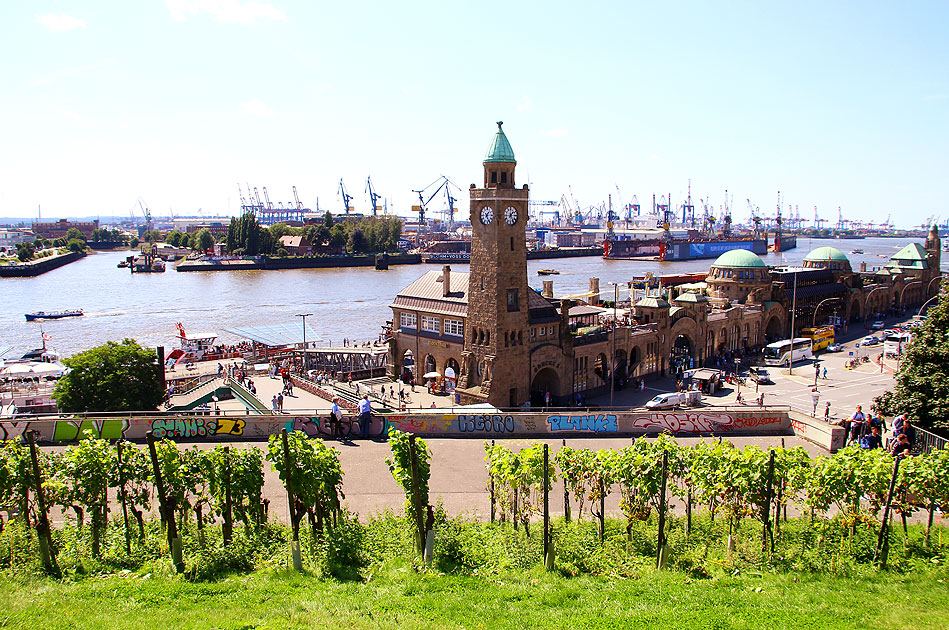 Das ist Hamburg-Symbolik: Die Hamburger Landungsbrücken mit der Elbe vom Stintfang aus fotografiert. Unten im Vordergrund der Weinberg auf dem Stintfang. Die Landungsbrücken sind heute die große Anlegestelle für Fähr- und Hafenrundfahrtenschiffe in Hamburg. In der Bildmitte der Pegelturm vom Abfertigungsgebäude, mittig rechts das Abfertigungsgebäude der Landungsbrücken. Digi Foto: IMG_6837.JPG Digi Fotos: 0287, FP5 (D14/D8/+#17) Foto: Lars Brüggemann |